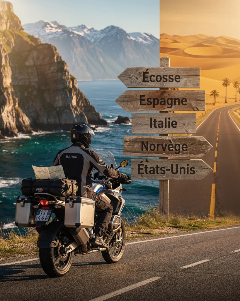 - Maroc : cols de l’Atlas, routes désertiques et pistes isolées. Une destination accessible, dépaysante et très appréciée des motards européens.